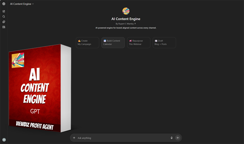 AI Content Engine is the all-in-one solution for scaling your brand messaging across every digital channel. Instead of juggling multiple writers or struggling to keep your voice consistent, this GPT instantly generates professional blogs, LinkedIn posts, ad copy, and emails tailored to your goals. Whether you want awareness, conversions, or thought leadership, AI Content Engine delivers content that speaks your brand’s language every ti